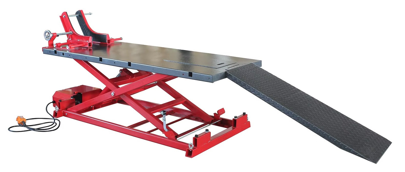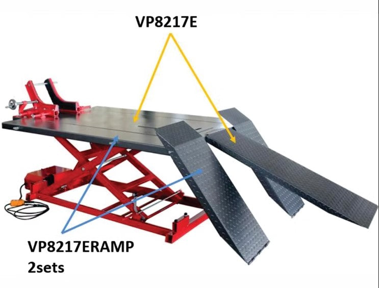 The VP8217E Electric Motorcycle Lift is a heavy-duty, high-capacity lifting table designed for the most demanding motorcycle and recreational vehicle maintenance tasks. With an impressive 680kg lifting capacity, this lift is ideal for larger, heavier motorcycles, scooters, and other vehicles. Equipped with extensions and accessories, it provides ample space and versatility for servicing and repairs. The electric power unit ensures smooth and controlled lifting, with a gentle range of motion that guarantees safety and ease of operation.