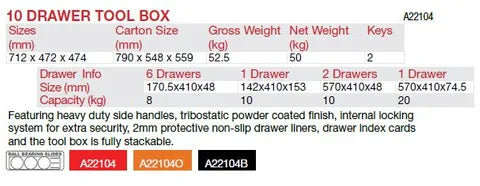 KC TOOLS A22104 Premium 10 Drawer Full Depth Toolbox